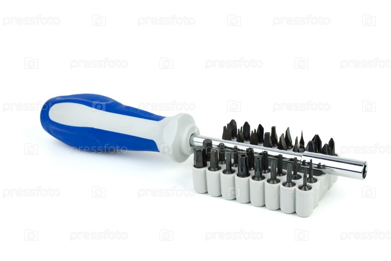 Универсальная отвертка и набор бит на белом фоне
