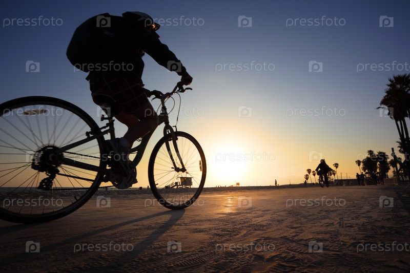 Силуэт велосипедиста на пляже на закате