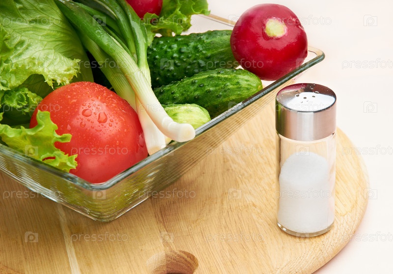 Свежие овощи и солонка на разделочной доске