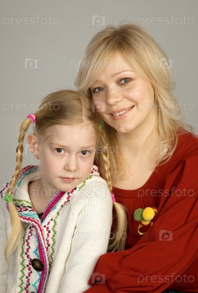 Счастливая женщина с дочерью, снимок в студии, серый фон