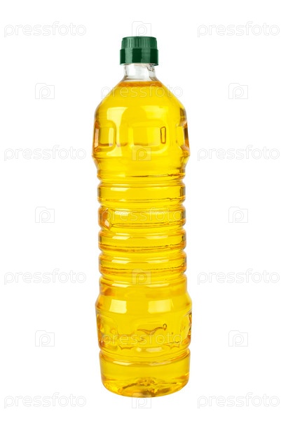 Пластиковая бутылка с подсолнечным (кукурузным или оливковым) маслом на белом фоне