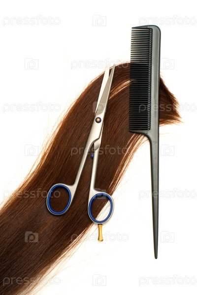 Ножницы, кисть для волос и локоть волос изолированы на белом фоне