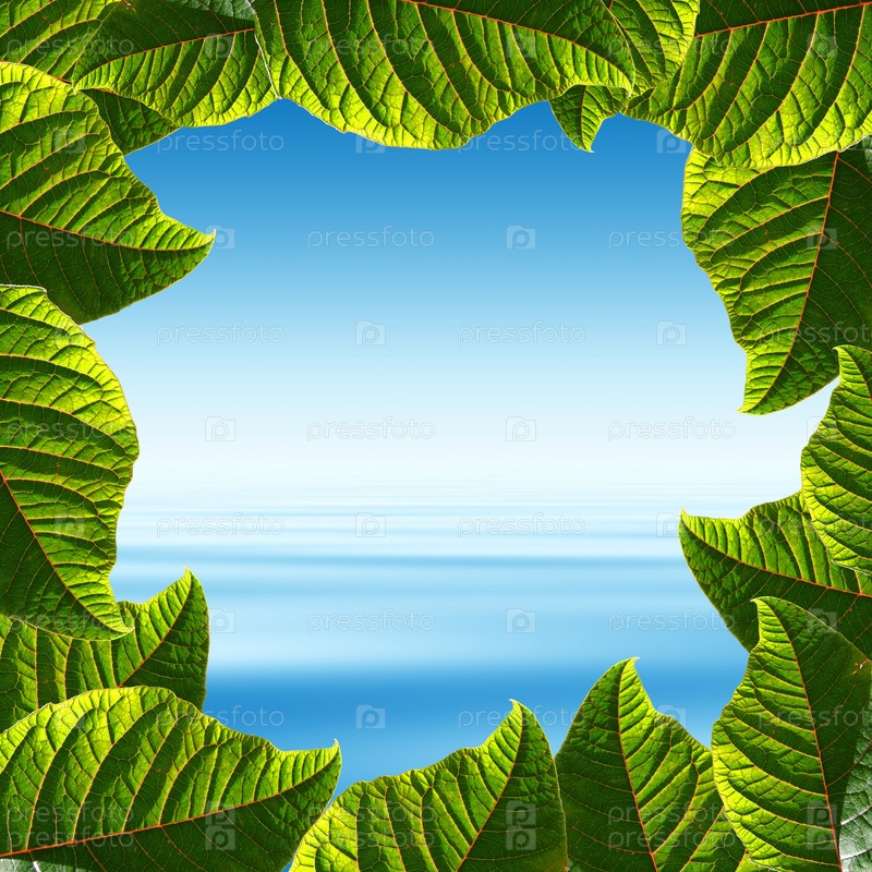 Голубое небо и вода в рамке из зеленых листьев