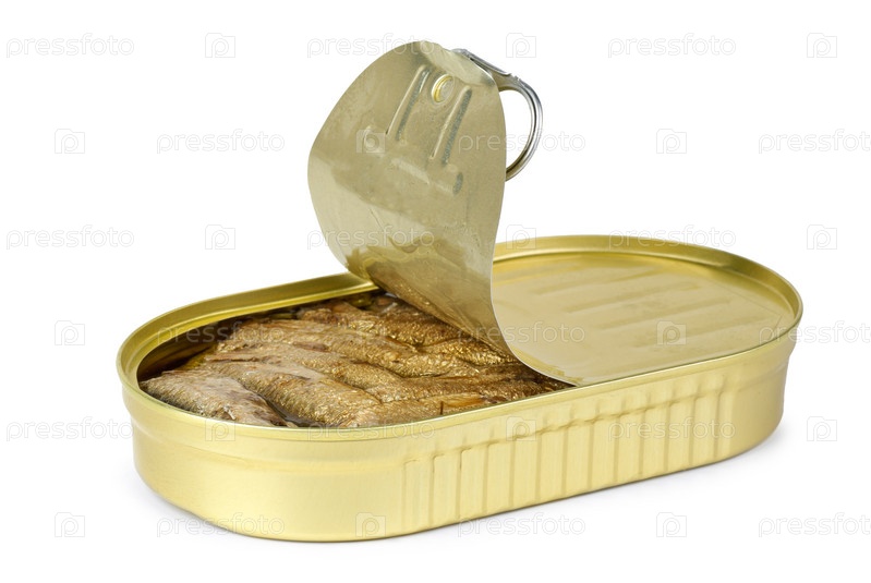 Открытая жестяная консервная банка со шпротами. Белый фон