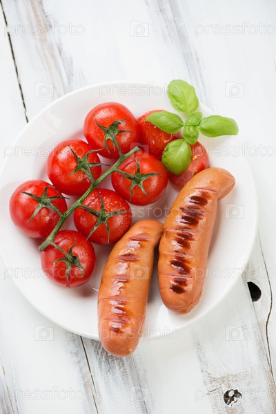 Жареные сосиски и жареные красные помидоры
