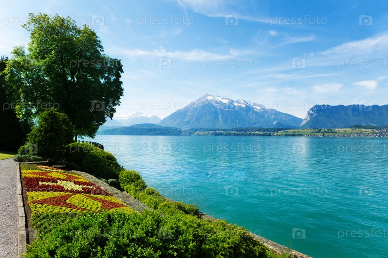 Сад, озеро Тун и Швейцарские горы