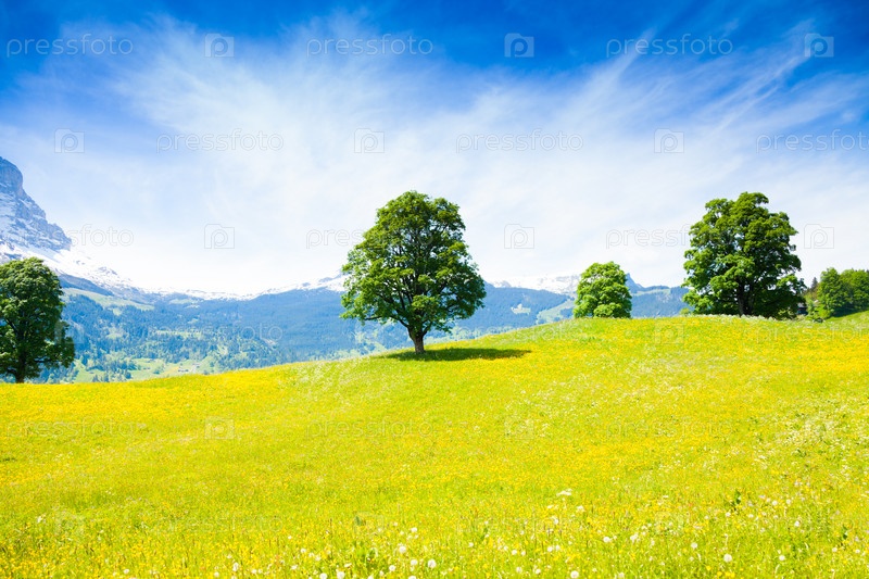 Желтые цветы в поле на фоне Альп