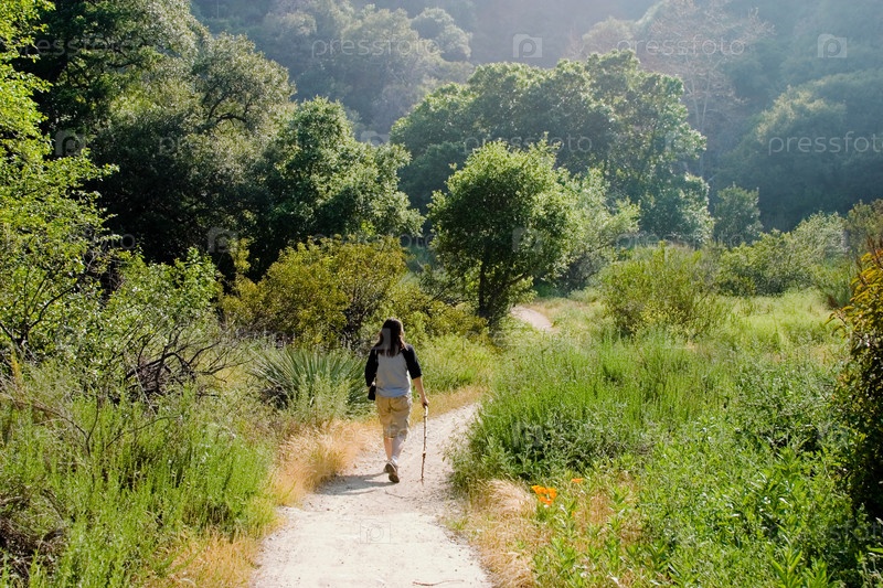 Женщина идет по тропинке среди зеленых деревьев и кустарников