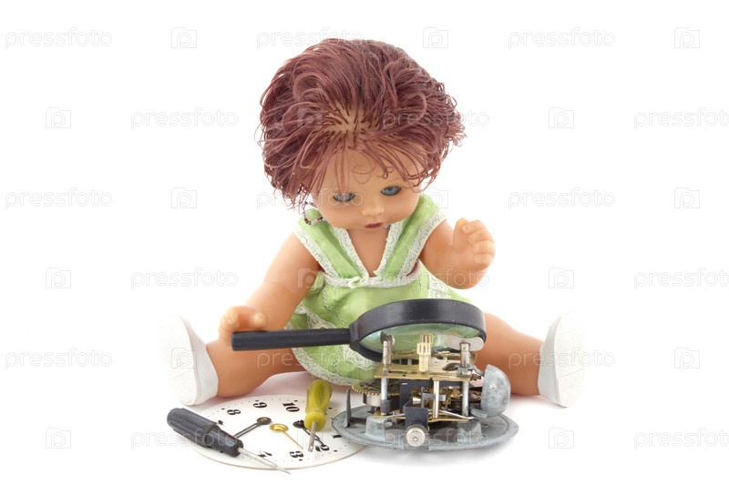 Кукла ремонтирует старый будильник, изолирована на белом