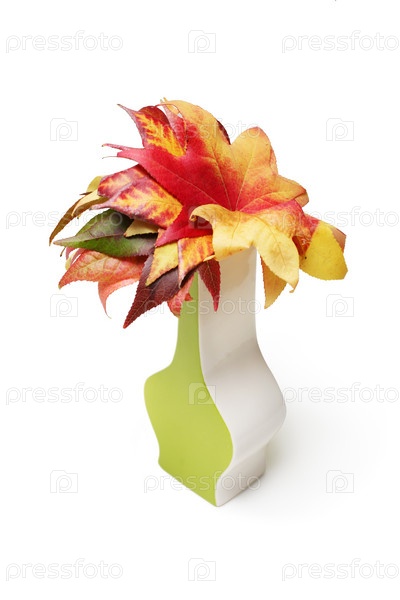 Фигурная ваза с букетом красочных осенних листьев на белом фоне