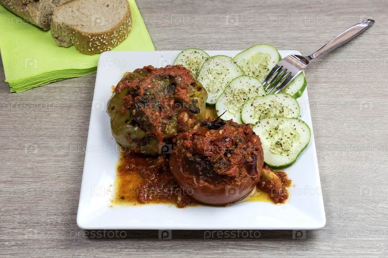 Перцы и помидоры начиненные фаршем и рисом, приготовленные в духовке(греческая кухня)