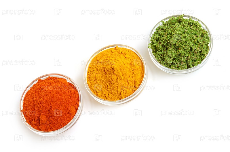 Кучи специй: петрушка, орегано, красный паприка и куркума
