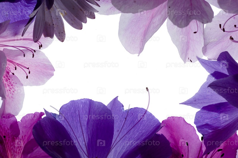 Фиолетовые цветы, выложенные в виде рамки на белом фоне