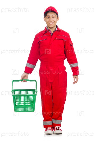 Человек в красном комбинезоне с корзиной для покупок