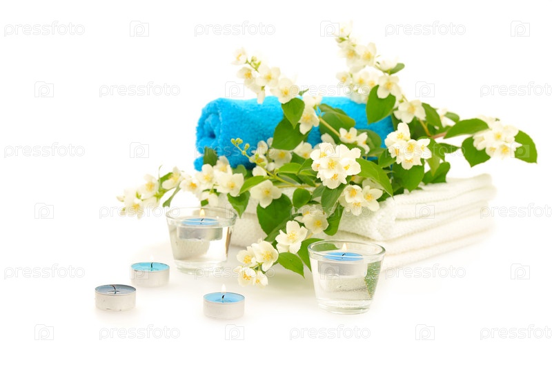Ветка цветущего жасмина, полотенца и горящие свечи на белом фоне