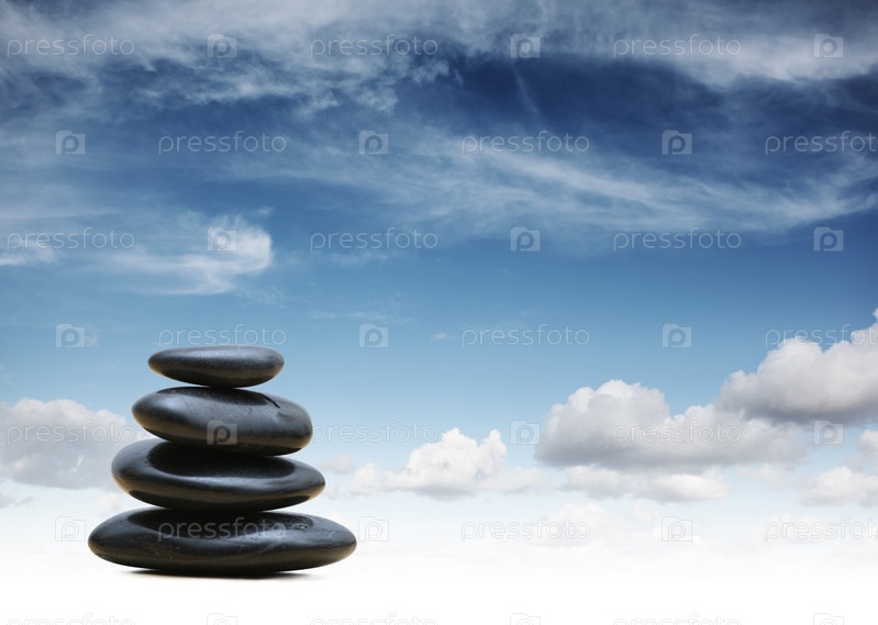 Пирамида из морских камней на фоне облачного неба