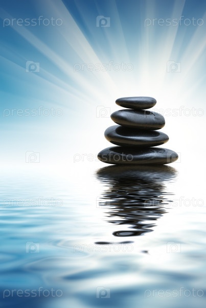 Пирамида из морских камней на фоне солнечных лучей