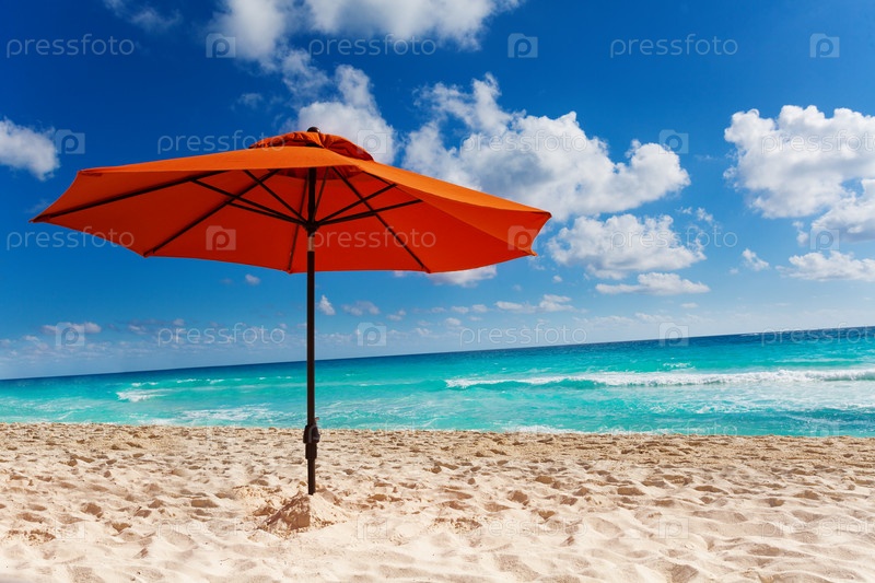 Оранжевый зонтик и шезлонг на пляже