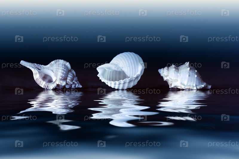 Три морские ракушки отражаются в воде на темно-синем фоне