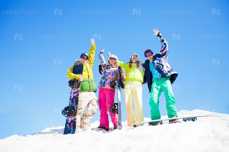 Друзья со сноубордами на снегу