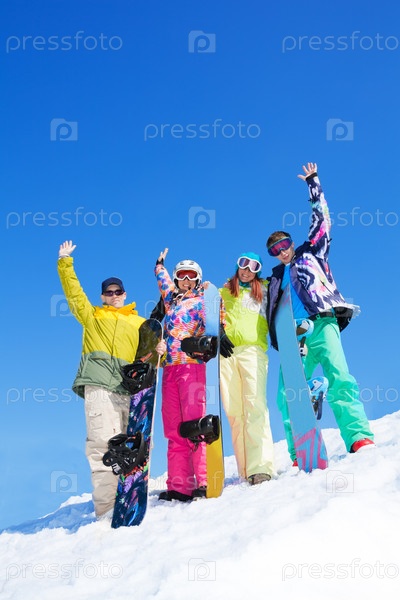 Друзья со сноубордами на снегу