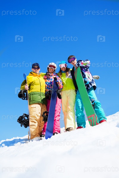 Друзья со сноубордами на снегу