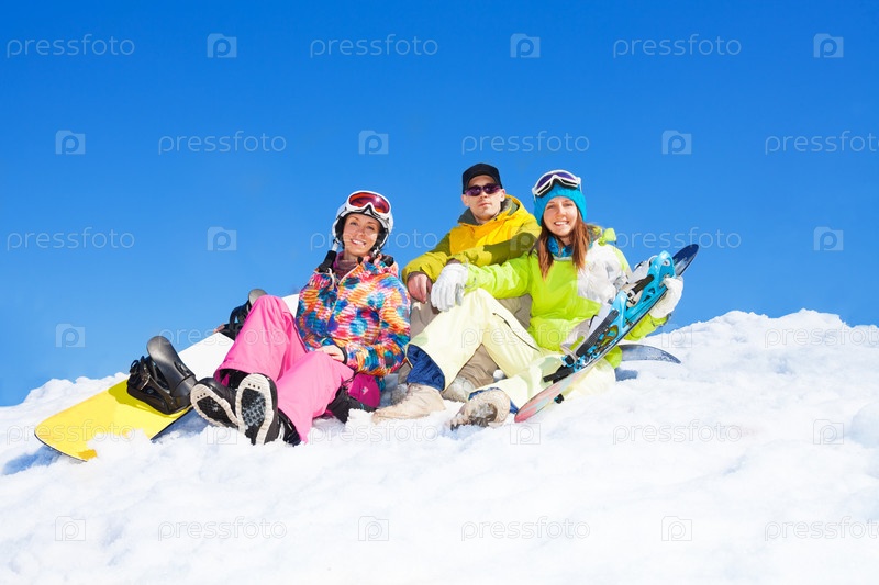 Друзья со сноубордами на снегу