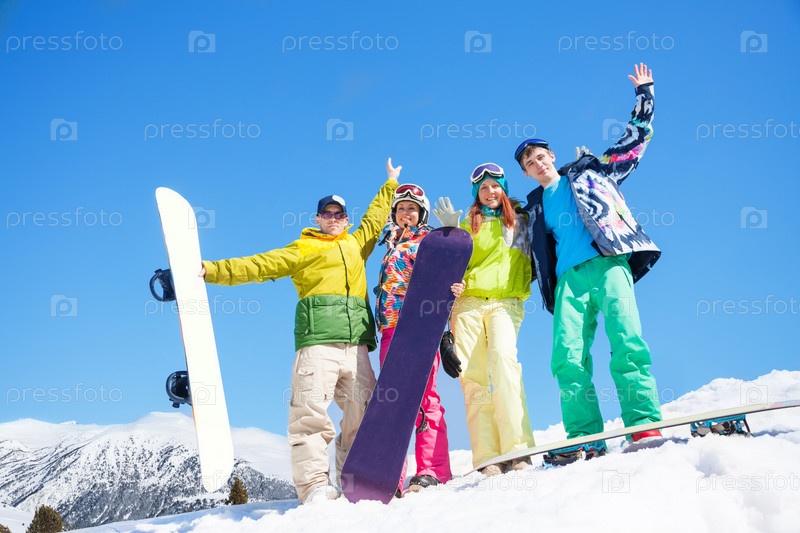 Друзья со сноубордами на снегу