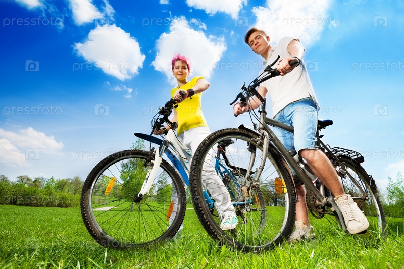 Пара с велосипедами на поляне