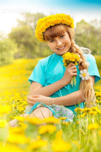 Девочка на поле с одуванчиками