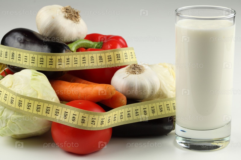 Овощи, стакан молока и измерительная лента на светлом фоне