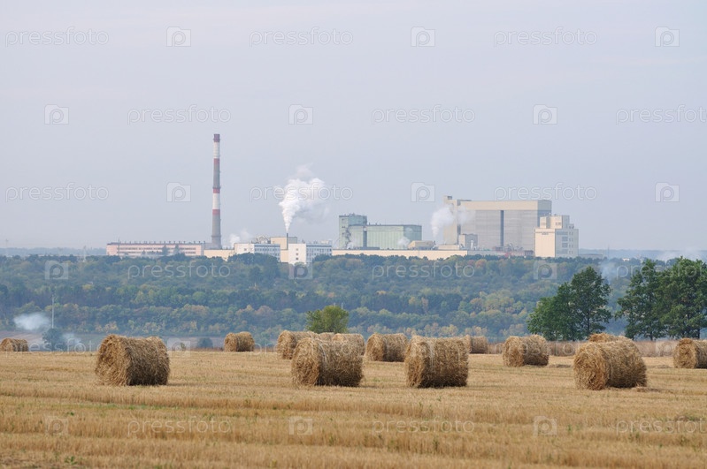Поле с тюками сена на фоне промышленного предприятия