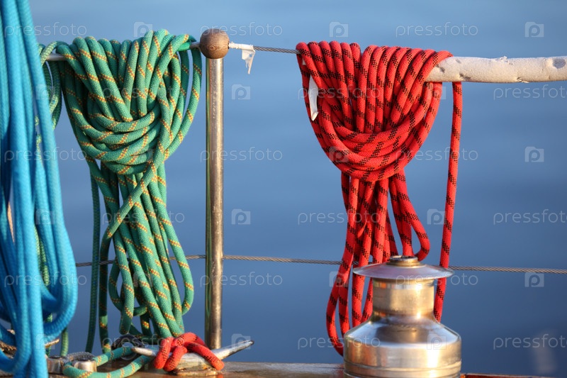 Яркие веревки висят на поручнях яхты