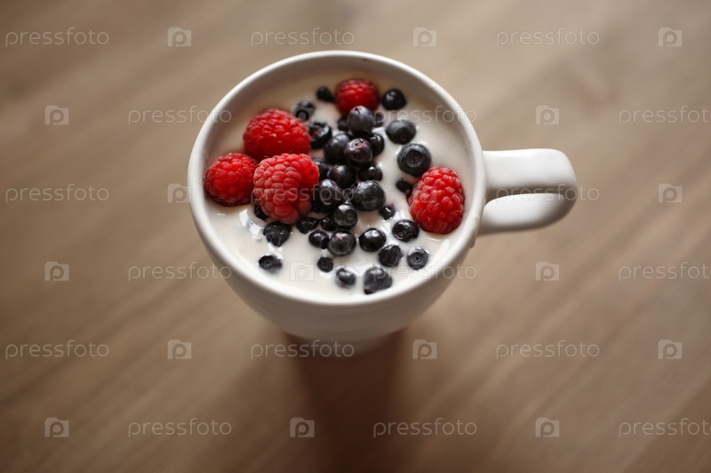 Чашка йогурта со свежей малиной и черникой на деревянном столе