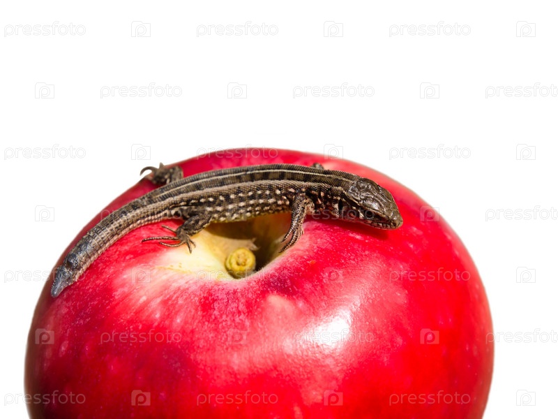 Рептилия на яблоке изолирована от белого (аналогия с злым змеем в раю)