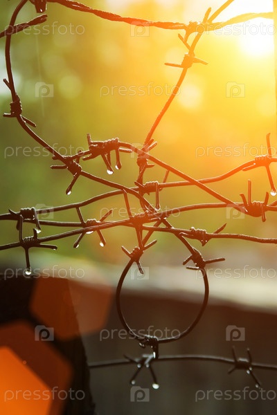 Колючая проволока крупным планом с каплями воды в солнечном свете