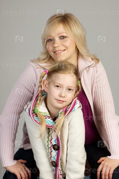 Улыбающаяся мать с ребенком, снимок в студии, серый фон