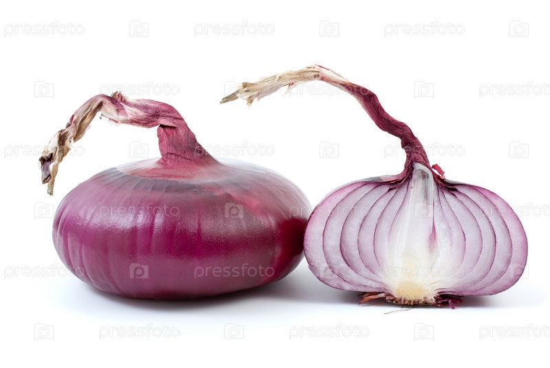 Целый красный лук и половинка на белом фоне