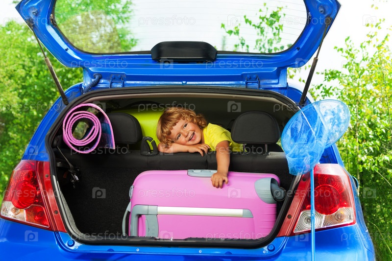 Мальчик в автомобиле с чемоданами