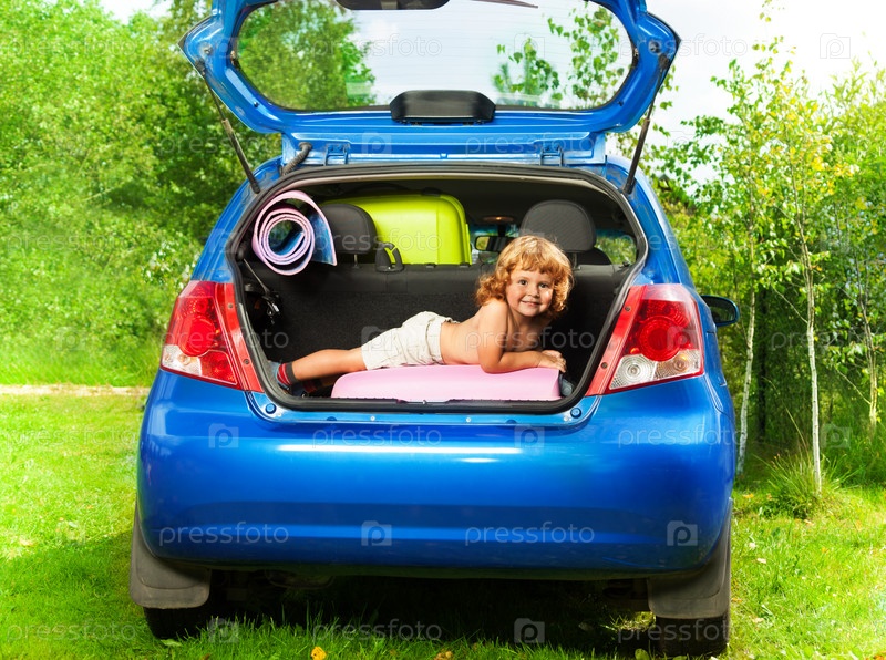 Мальчик в автомобиле с чемоданами