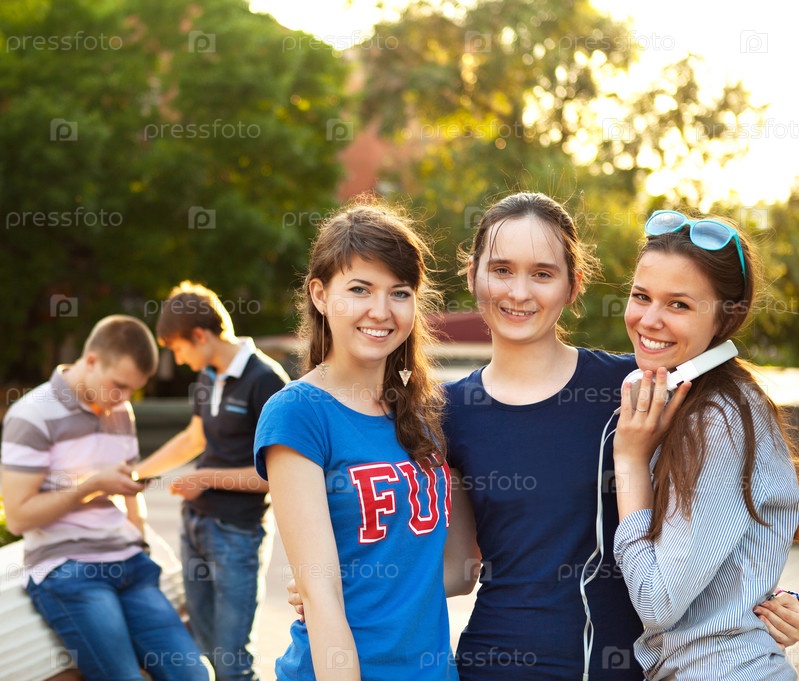 Группа студентов или подростков с тетрадями на открытом воздухе