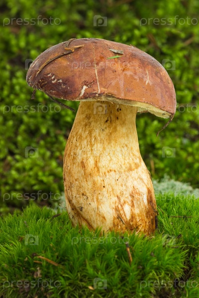 Белый гриб на фоне зеленого мха