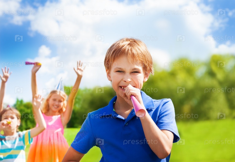 Счастливый мальчик дует в рожок