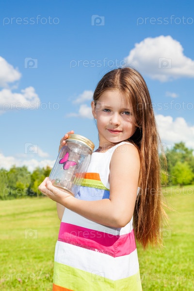 Девочка держит банку с бабочкой