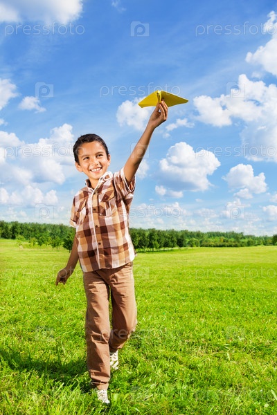 Счастливый мальчик бросает бумажный самолет