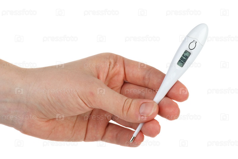 Рука держит электронный градусник, показывающий высокую температуру. Белый фон