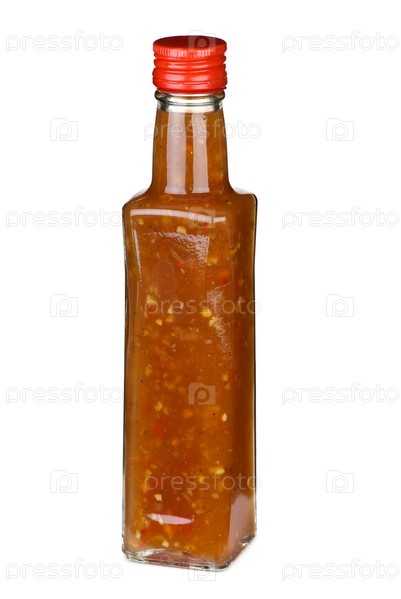 Бутылка острого томатного кетчупа на белом фоне