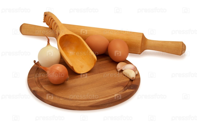 Лук, яйца, чеснок, совок, скалка на деревянной доске