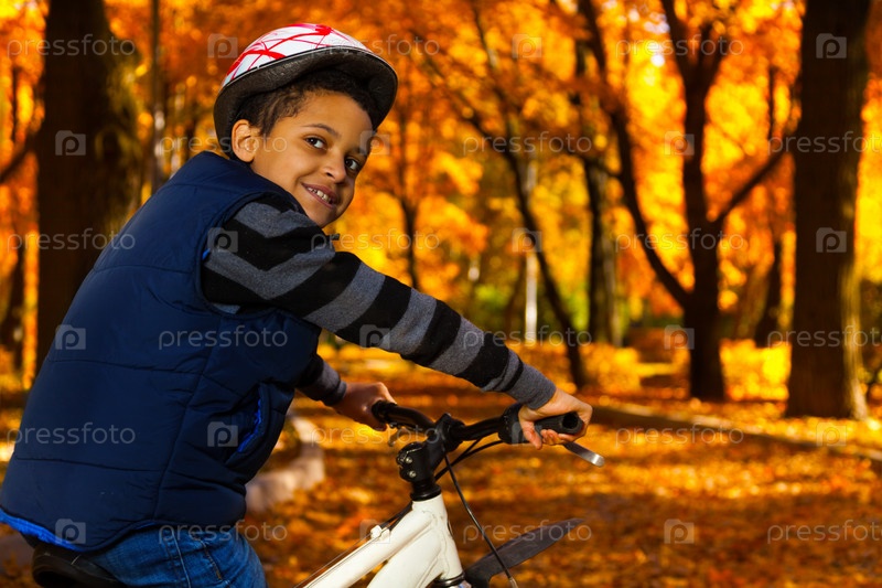 Счастливый мальчик на велосипеде в парке