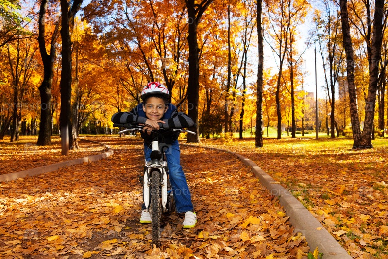 Счастливый мальчик на велосипеде в парке